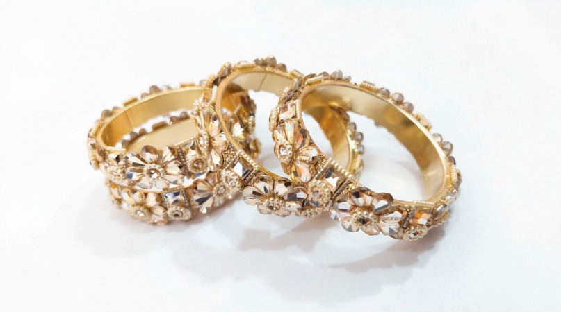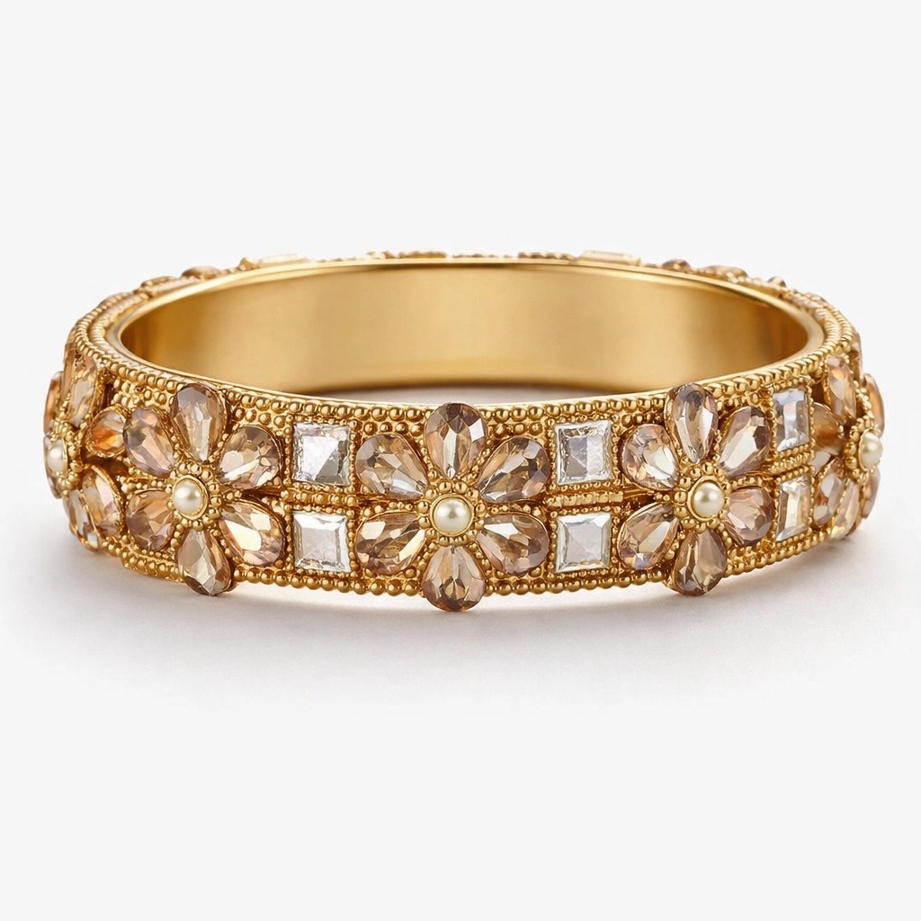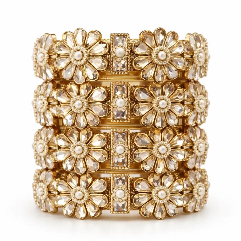 Intricate Floral Motif: Each bangle is adorned with meticulously crafted flower patterns, featuring faceted crystals that mimic the petals of a blooming flower.