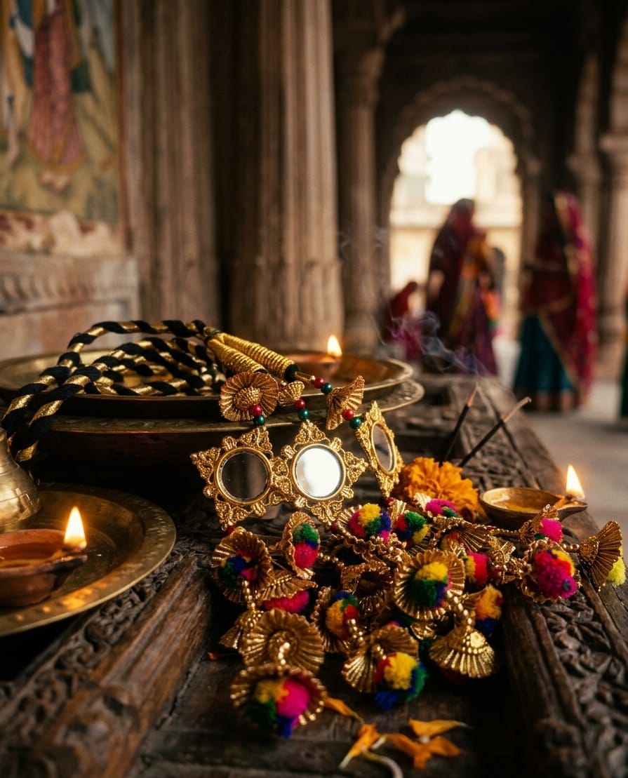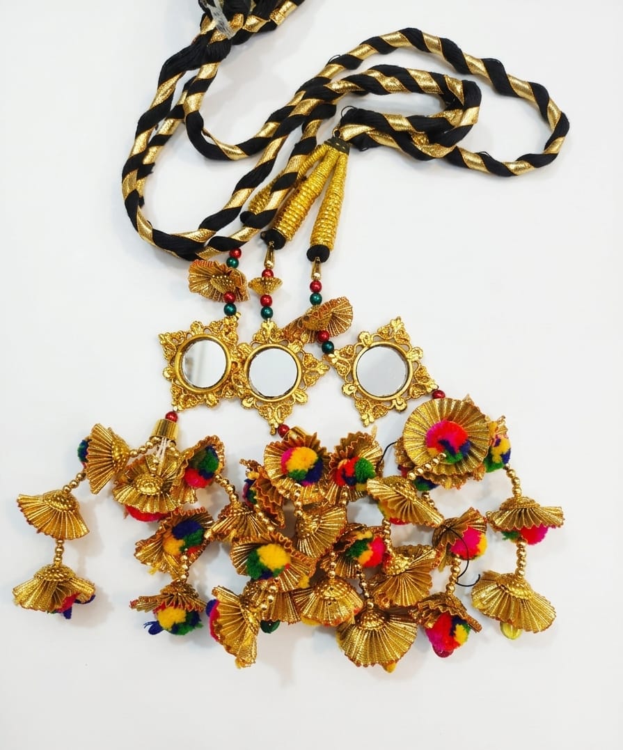 Golden Tassels (Guchha): Decorated with multiple gold metallic bells and pleated fan-shaped ornaments that provide volume and a premium look.