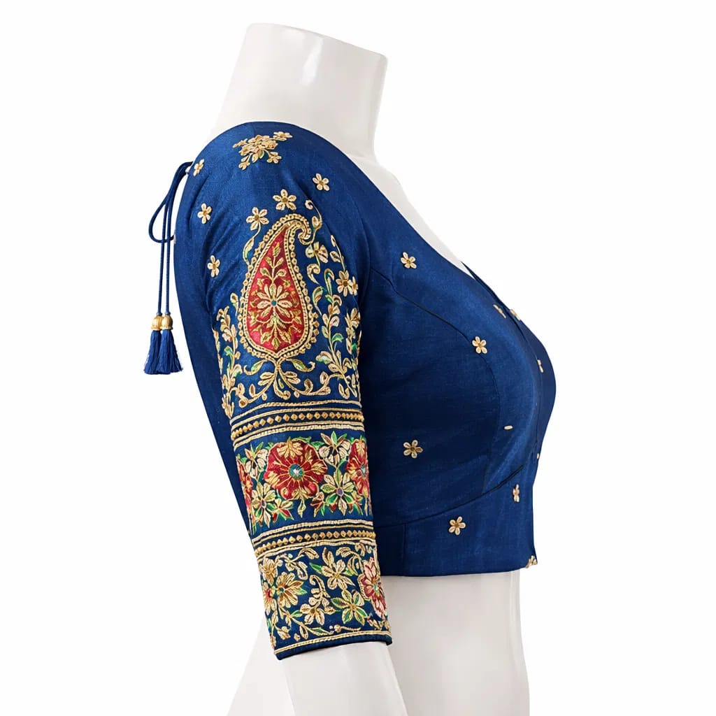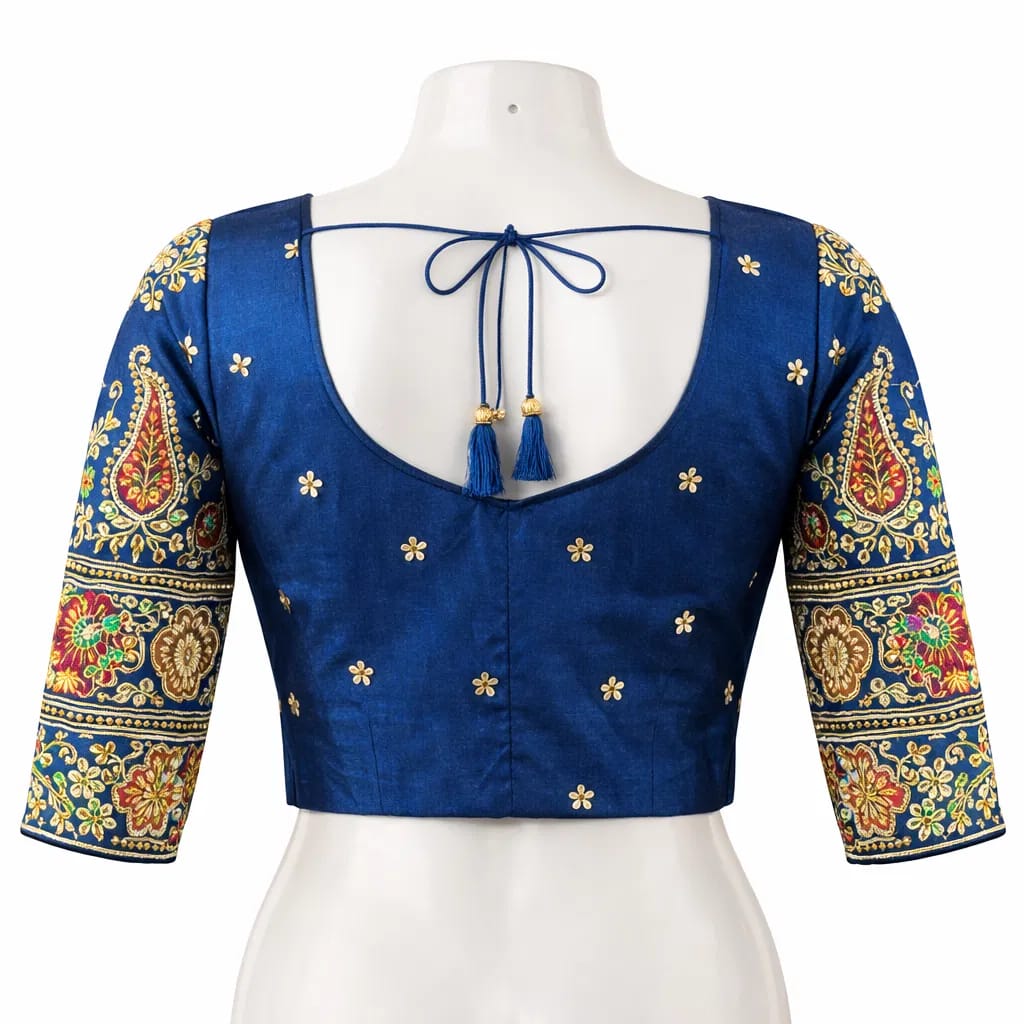 This Royal Blue Silk Blouse is a masterclass in traditional Indian ethnic wear, blending luxurious fabric with intricate handiwork. It is designed to be the centerpiece of a formal ensemble, often paired with high-end silk sarees like Kanjeevaram, Banarasi, or heavy Georgette.